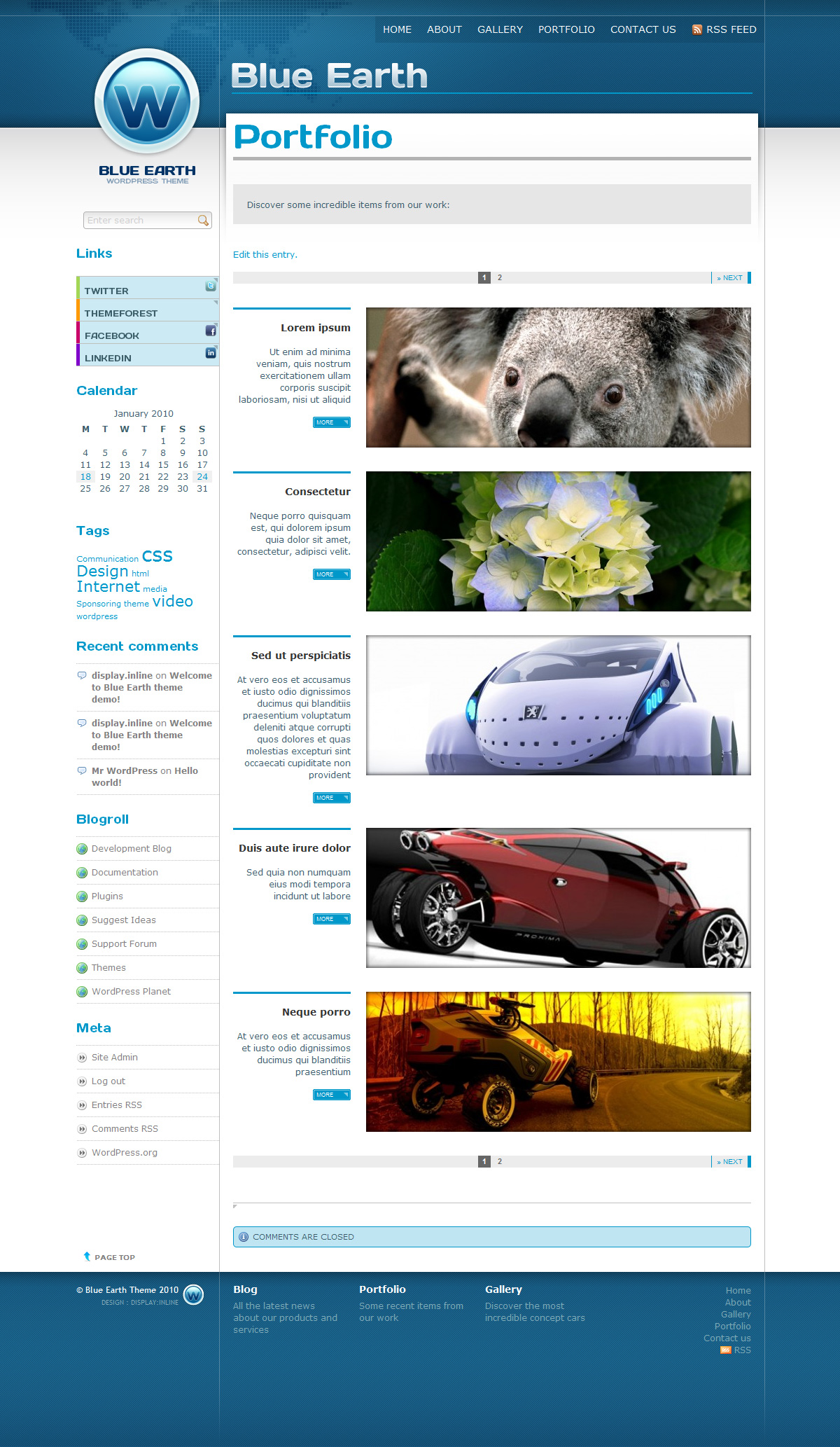 Blue Earth is really a Wordpress Theme, ideal for a company or company. It has an animated contact page, an ajax gallery along with a portfolio module with two different jQuery slideshows. Web site supplies a complete admin panel to handle and personalize everything just inside a click.