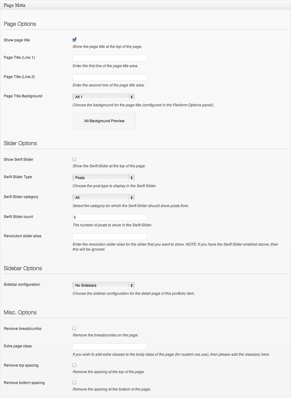Powerful Meta Options. Our meta options integration provides the flexibility to control the layout of each page/post, setting sidebars, thumbnails, links, and more. You can view the provided meta options here.