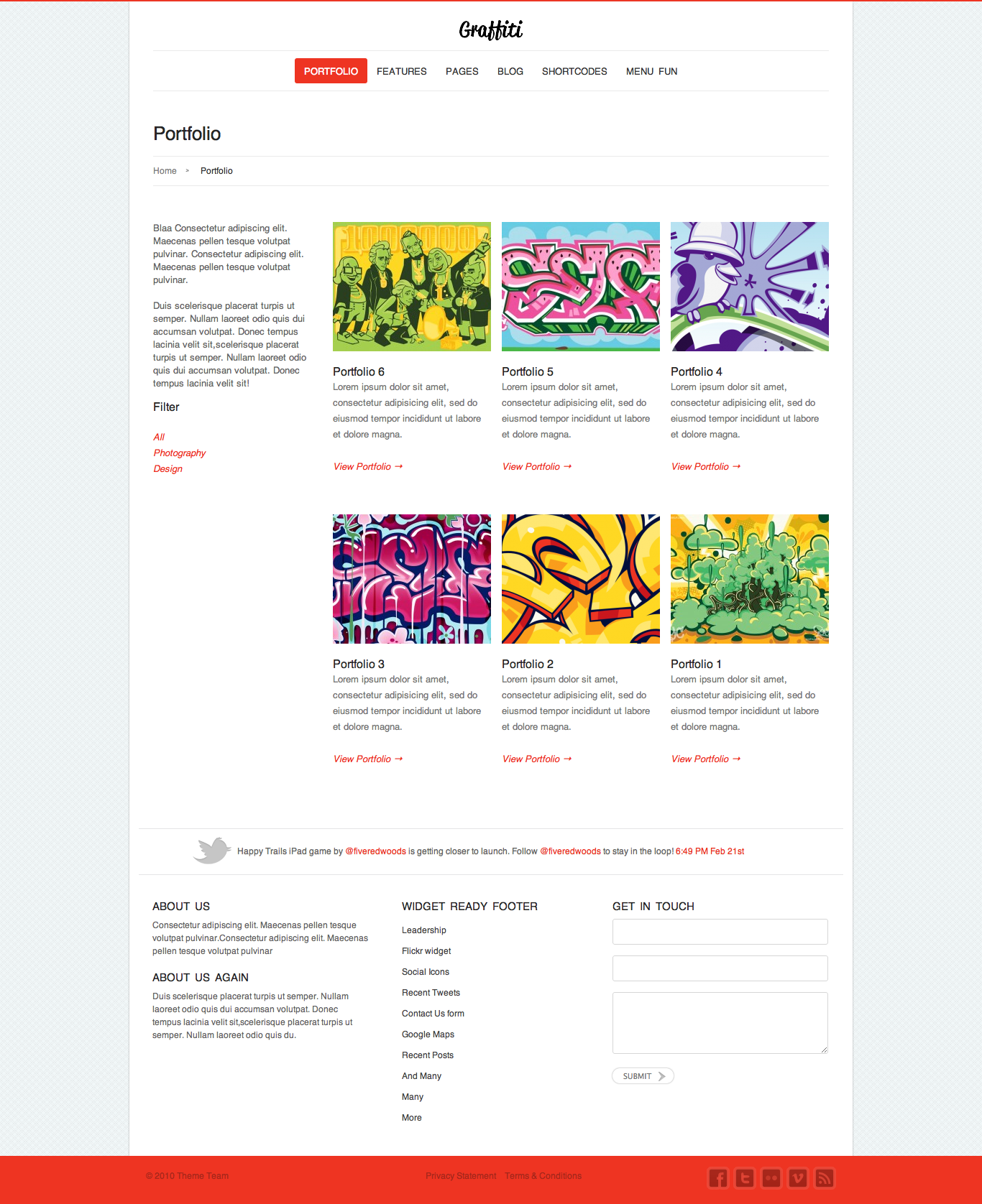 Graffiti may be the theme for that designer who can’t help but showcase! With multi-image lightboxes, scrolling portfolio art galleries and portfolio images featured around the home page, your projects is on a corner of every page.