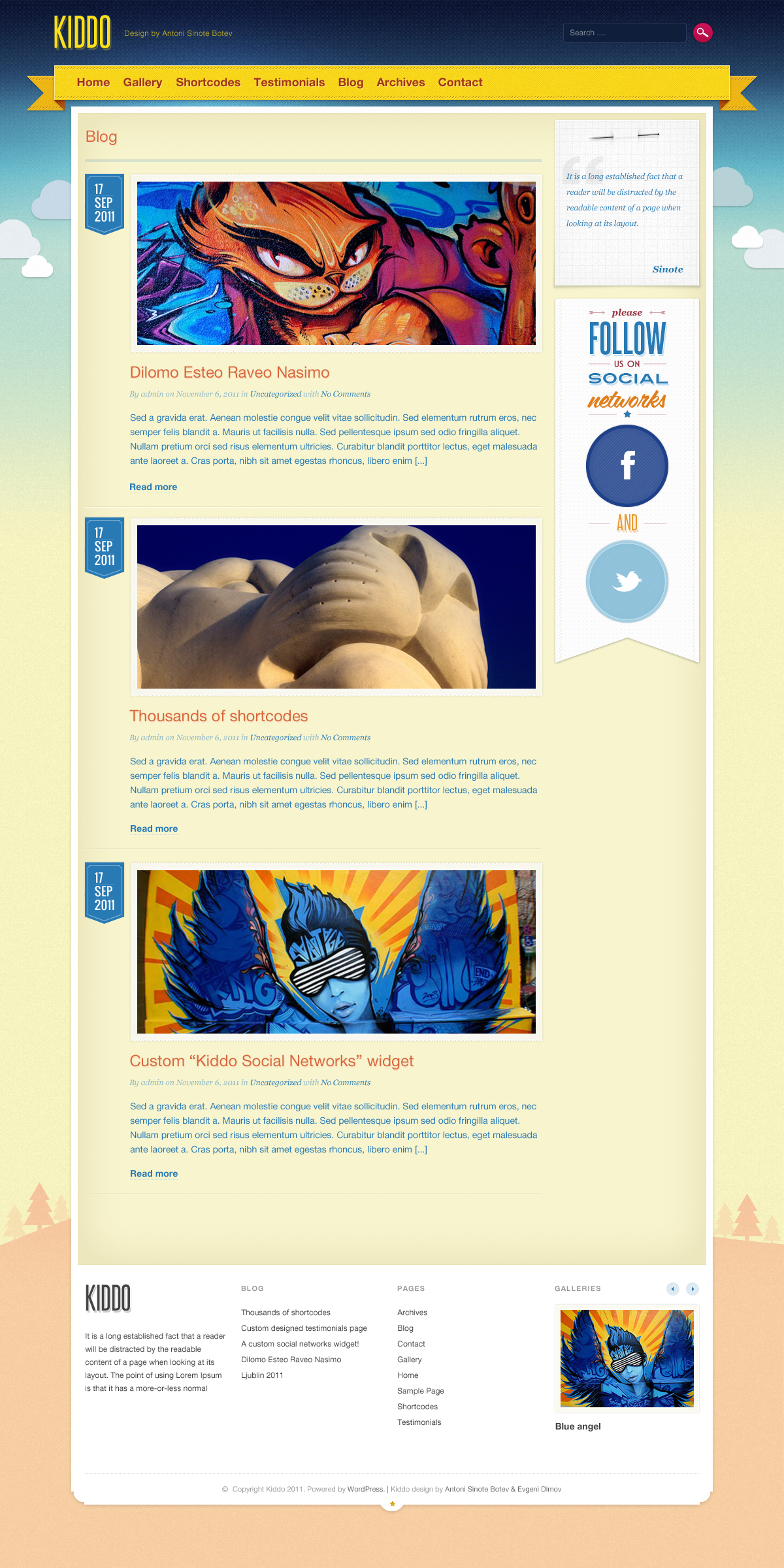 Every modern website requires a direct reference to an array of internet sites. Within this wordpress kids theme I've created a custom internet sites widget that enables you to definitely connect your children site with 13 different internet sites. I have faith that this helps your website achieve a bigger audience and assistance to engage your customers who are curious about your company or items. Using the custom internet sites widget you can connect your website with 13 systems including: facebook, twitter, dribbble, forrst, youtube, flickr, linkedin, vimeo, my space, stumbleupon, tumblr, behance network and deviantart. The theme includes separate custom icons for 3 of the largest systems – facebook, twitter and flickr.