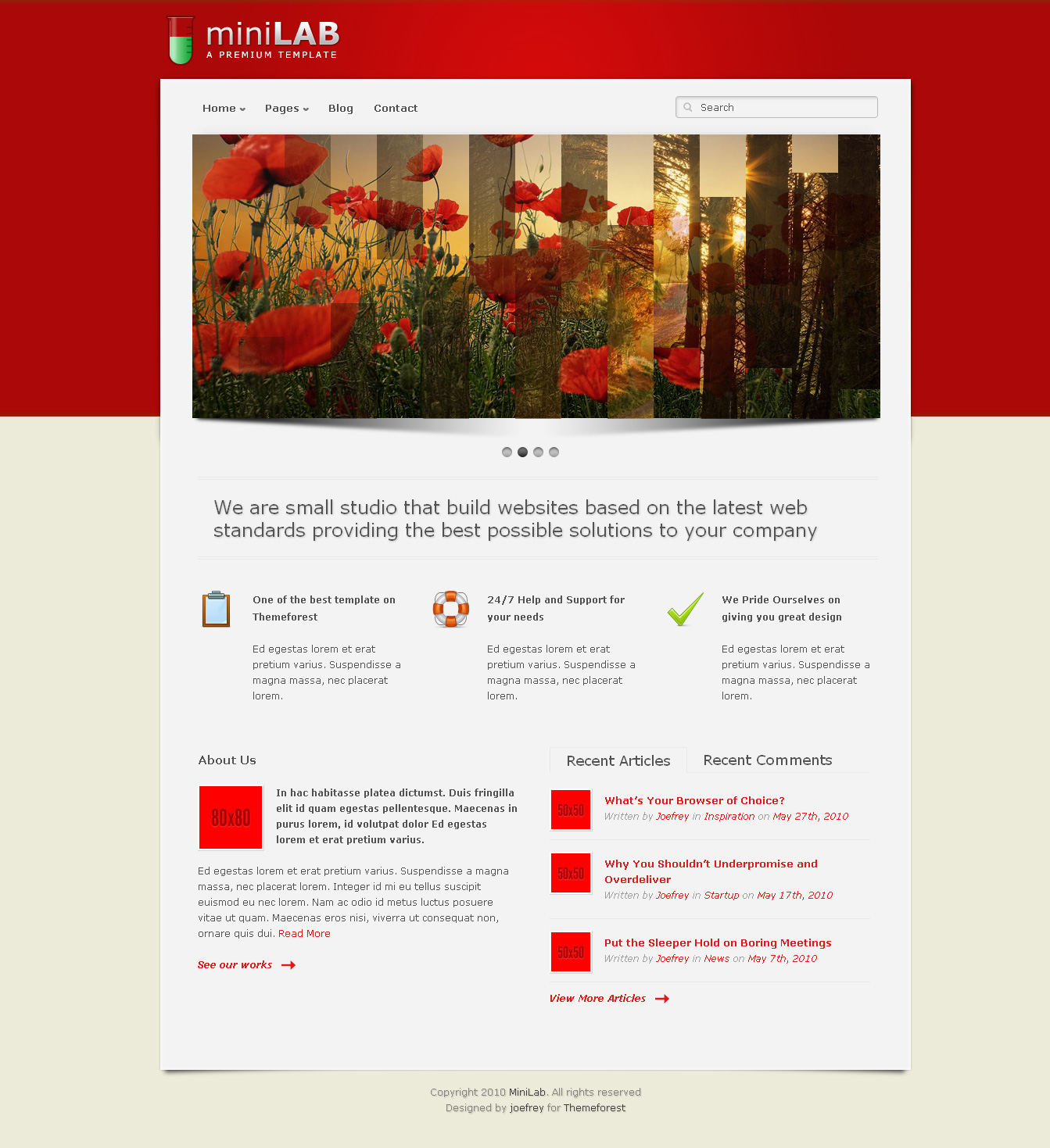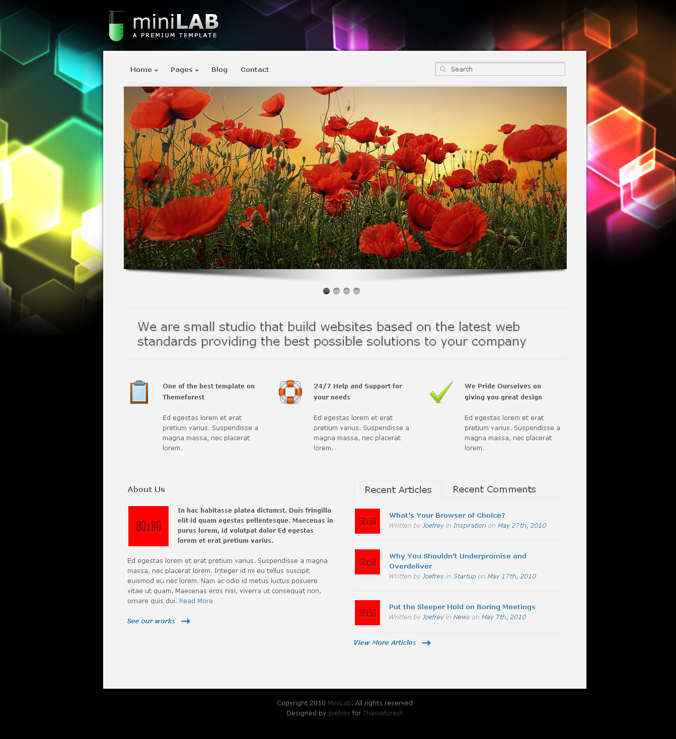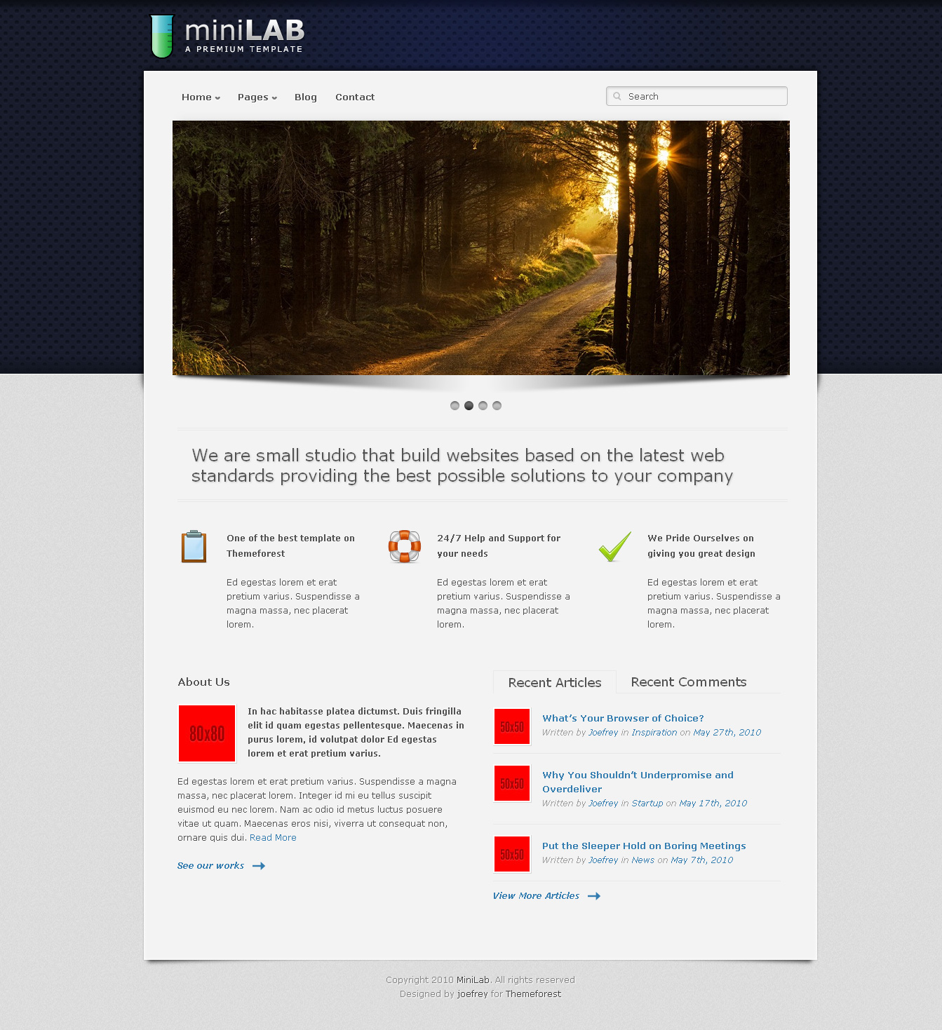 Small Lab is really a a very-easy to customize premium WordPress theme that's great for business, blog, exhibiting items, portfolio, etc. It's ready pages to personalize with and 15 styles to select from. You will find 3 35mm slides to select from namely, Nivo, three dimensional Slider and LoopedSlider + 1 Static image. The portfolio has two options to select from, namely, Categorized Portfolio and Switch (Thumbnail only or Thumbnail with Description).