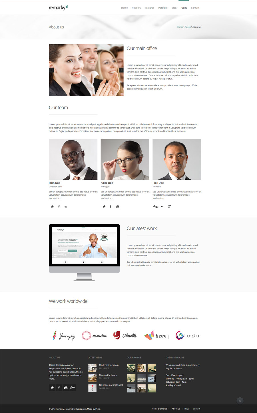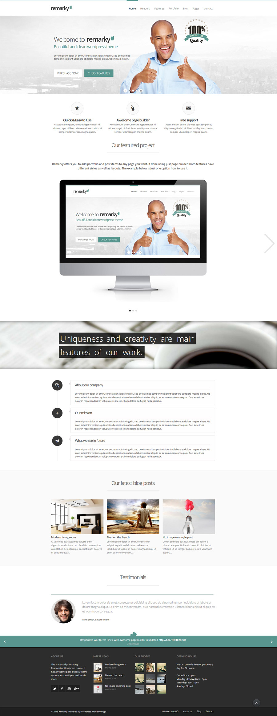 Remarky is really a Fully Responsive Wordpress Theme with lots of features: simple to use page builder, on-click Theme Options, fully resposnive design, limitless slider mobile phones, limitless designs, limitless colors, easy header layout altering (3 different headers), on-click vary from wide to boxed version, different publish and portfolio designs, many helpful shortcodes built-into the page builder, all Google fonts plus much more. The primary feature is really a strong page builder that provides you to definitely create wonderful, unique designs with only clicks.