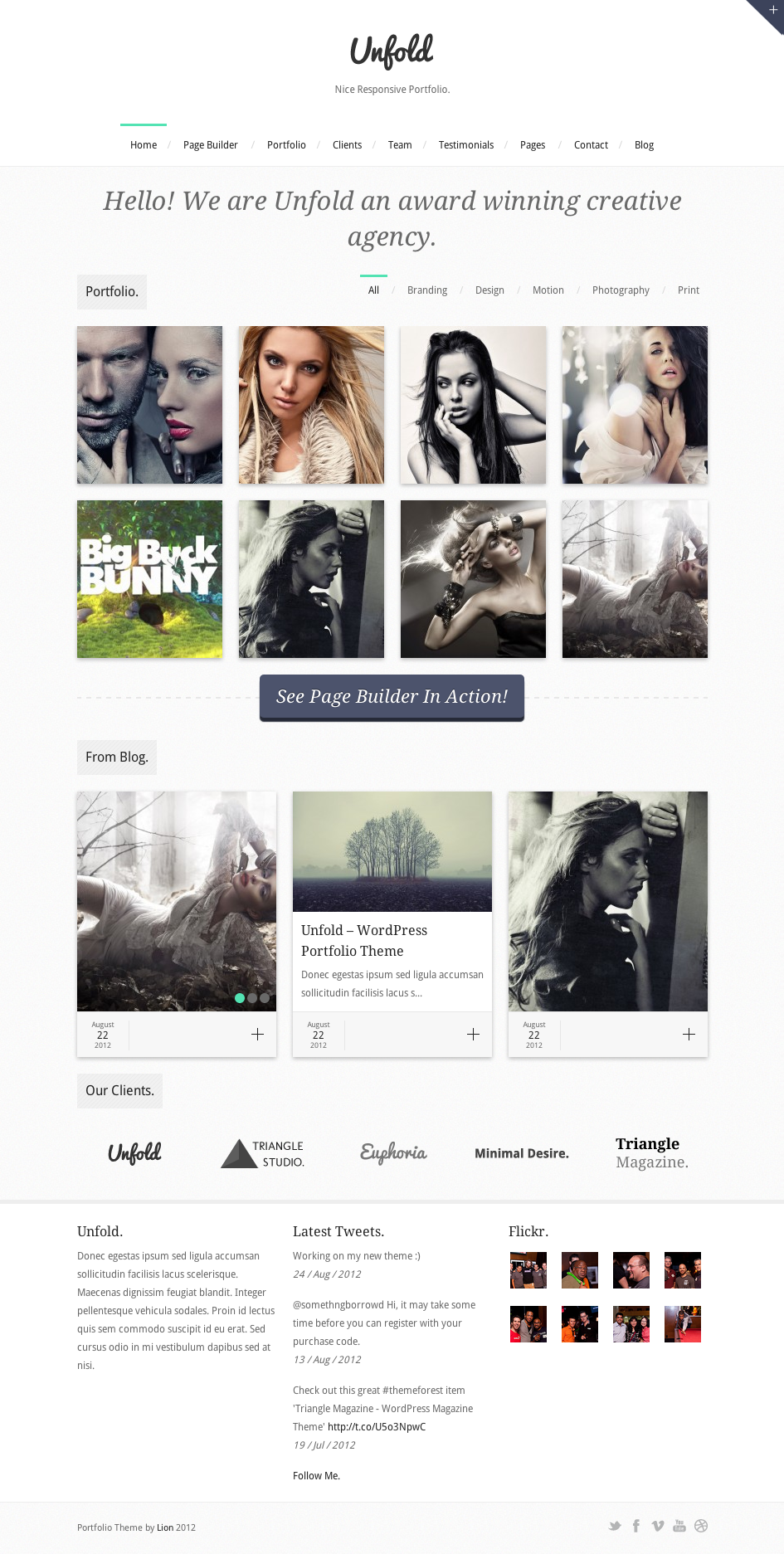 Unfold is clean responsive WordPress portfolio theme. It arrives with Page Builder with 11 unique modules and filterable AJAX Portfolio. Ideal for portfolio/showcase site.